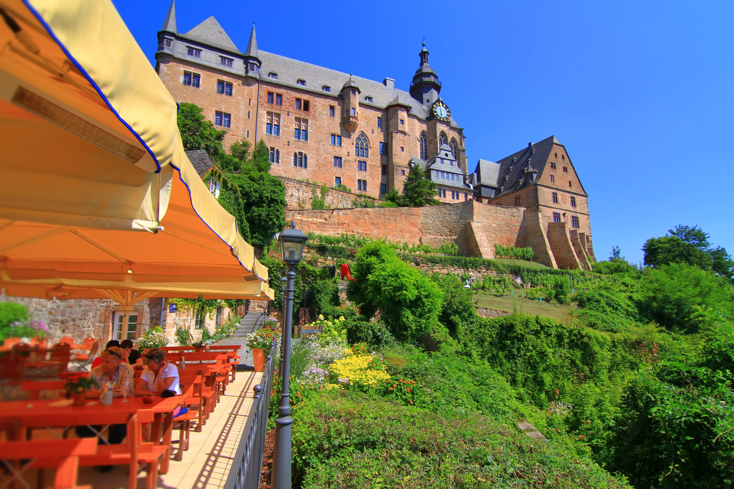 Und wer mit seinen Kindern auf der Suche nach spannenden Freizeitaktionen ist, für den bietet sich zum Beispiel der Marburger „Grimm-Dich-Pfad an“, der an 7 Stationen mit Märchenfiguren in luftiger Höhe an Häusern, Treppen und Mauern zum Aufstieg durch die historische Altstadt bis hinauf zum Schloss mit 109 Metern Höhenunterschied führt. Aschenputtels Schuh – da ist er. Knallrot, mit hohem Hacken und in überdimensionaler Größe. Der Schuh befindet sich nicht am Fuß von Aschenputtel, sondern am Fuß des Landgrafenschlosses, das hoch über der Marburger Altstadt thront. Station für Station begegnen Marburger Besuchern Märchenfiguren aus den Erzählungen der Brüder Grimm, die eine Zeit in Marburg lebten und studierten. Dem Froschkönig zum Beispiel. Das tapfere Schneiderlein. Der Hase und der Igel. Schneewittchen. Oder der Wolf und die sieben Geißlein. Wer Märchen liebt, muss also nicht bis ins Disneyland reisen.